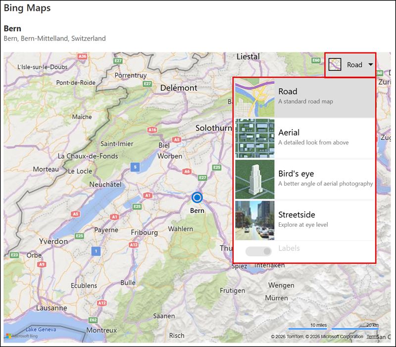 The Business Entity search (POI or organization name lookup) will be discontinued, as the underlying service retires in June 2026. The Bird’s Eye and Street View modes will also be removed, with the web part falling back to Road view.